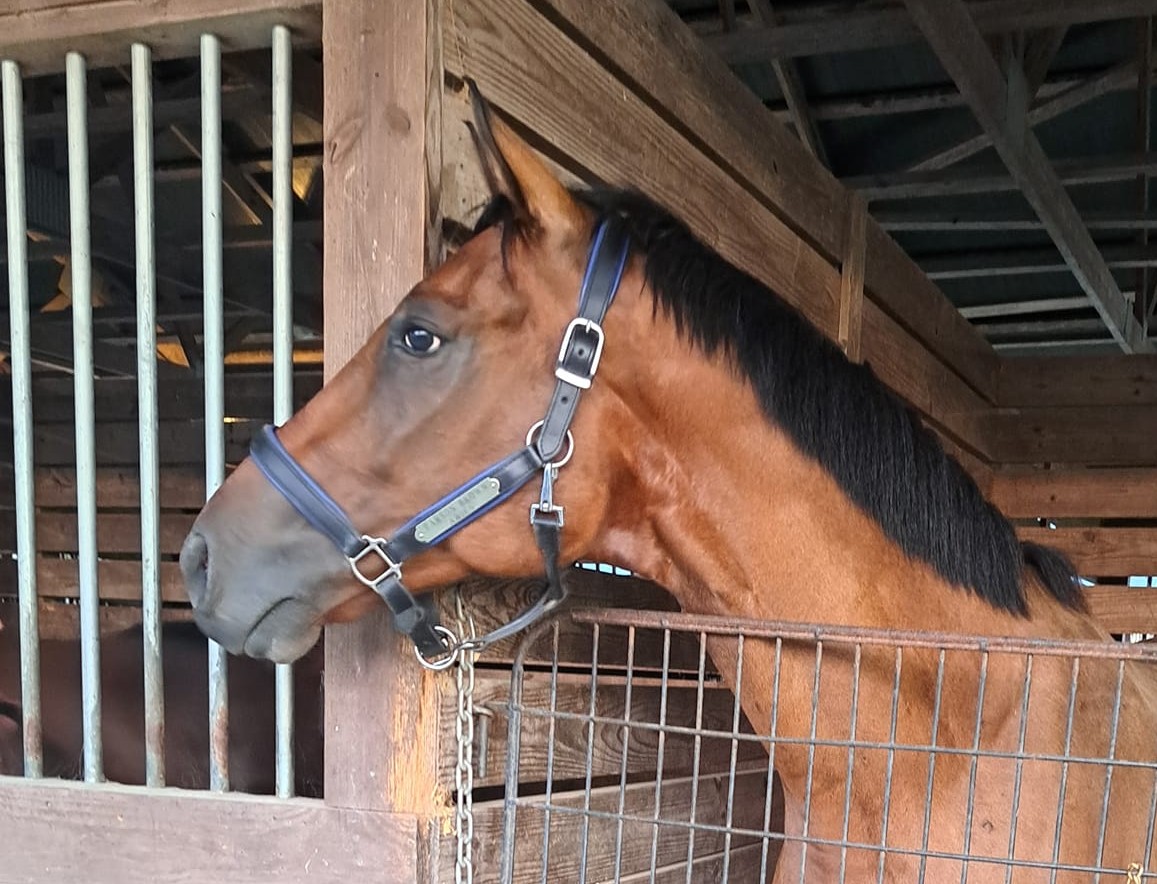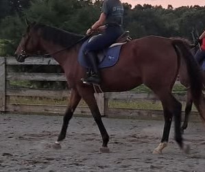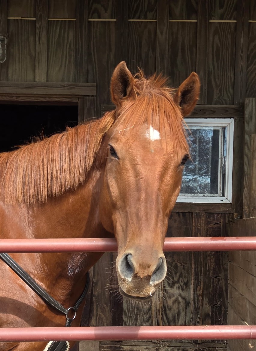 Hi! I’m Helios. I am a 16-hand bay off-the-track Thoroughbred with a puppy-dog personality. I had a productive racing career and won over $100,000 before I retired from the track. I liked racing but I love my current job in Stacey’s program. You’ll often catch me “smiling” with my front teeth out while being groomed. Sometimes, if you find the right itchy spot I’ll lean into it and shake my back leg like I see the golden retrievers around the barn do! I specialize in intermediate riders and love helping them grow in confidence. When I’m not working, I’m almost certainly getting into mischief with my friends in the field. I am one of the three amigos that are always up to some sort of shenanigans. My specialty is hiding my shoes in the mud so I get to see our farrier more often. Our farrier would never admit it, but I know I am his favorite. I’m silly, sweet, and always happy to see what the day brings.