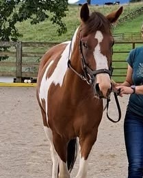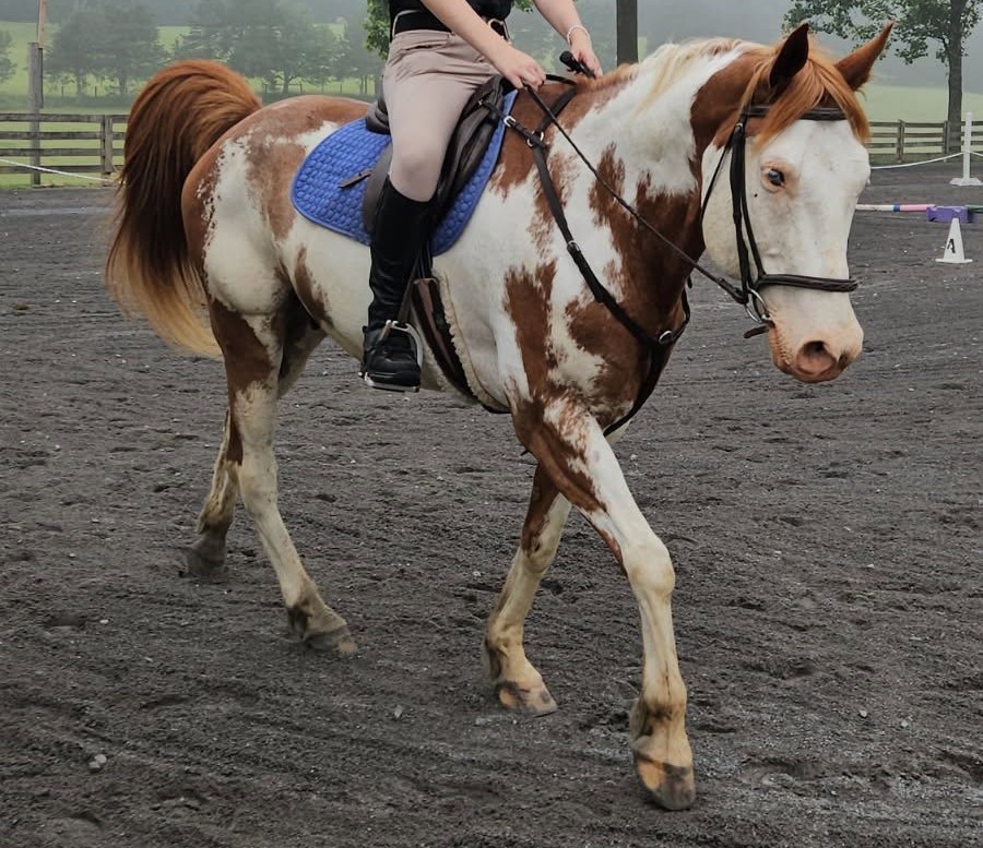 Hello, I’m Minka. I am a 14.3-hand paint mare who is sweet but very particular. I work with advanced beginner and intermediate riders and take my teaching role seriously. Jumping is my favorite, but I also like to lead the group when we warm up or cool down hacking out in the fields. I expect my students to show up ready to work, and I’ll make sure you put in the work to be your best. If you prove to me I can trust you by showing me your horsemanship and effective riding skills I will return the favor and take care of you along the way. I have high expectations to earn my trust, but if you meet them, I’m a wonderful partner and a very proud teacher.